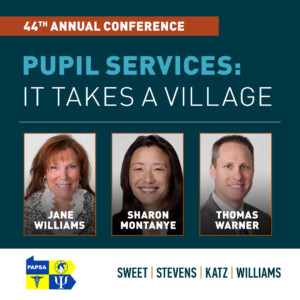 New Britain, PA – For the 20th consecutive year, the attorneys of Sweet, Stevens, Katz & Williams LLP will present the Paul Stevens Memorial Legal Seminar at the 2023 Pennsylvania Association of Pupil Service Administrators (PAPSA) conference. The 44th annual conference, “Pupil Services: It Takes a Village,” will be held in person April 12-14, 2023, at the Inn at Leola Village in Leola, PA and also streamed online. The Sweet Stevens presentation is the culminating session on Friday, and a highlight of the event.